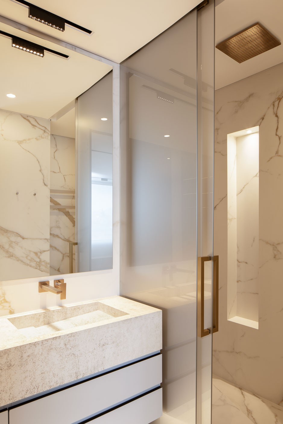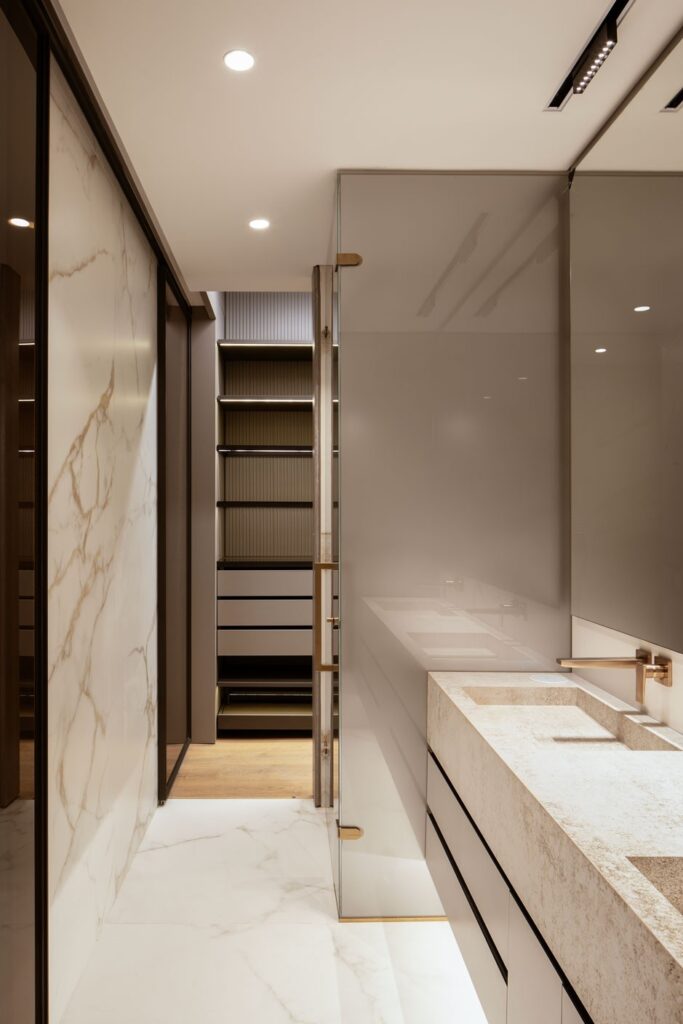 Se utilizaron griferías de alto desempeño y revestimientos de gran formato, resistentes a la humedad y al uso constante, mientras que la iluminación indirecta aporta una atmósfera controlada y confortable.