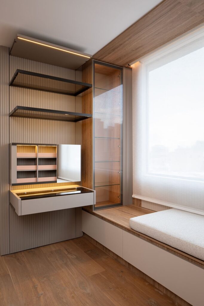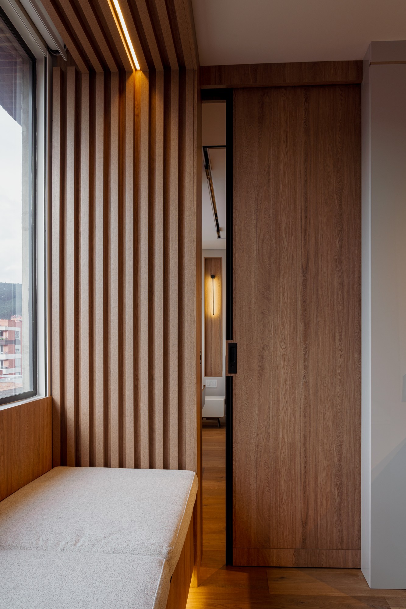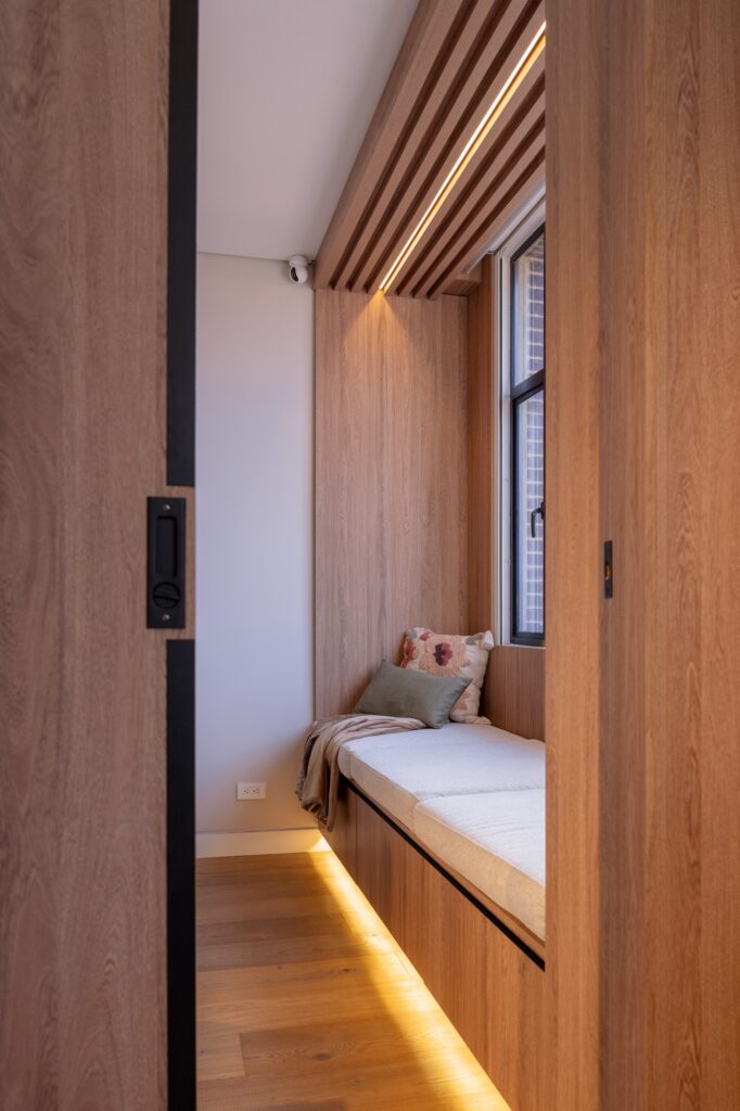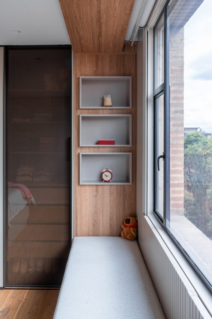 La carpintería se diseñó completamente a medida, concebida como un sistema integral que responde con precisión a la forma de habitar cada espacio.