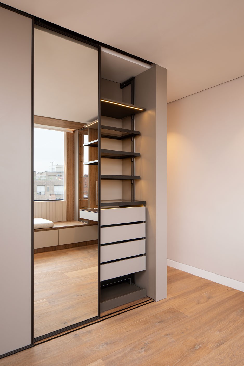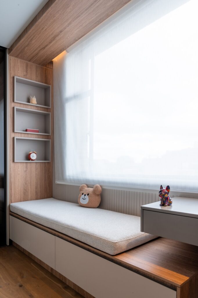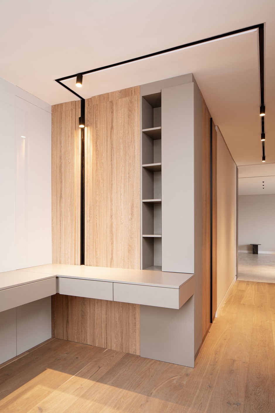 La carpintería se diseñó completamente a medida, concebida como un sistema integral que responde con precisión a la forma de habitar cada espacio.