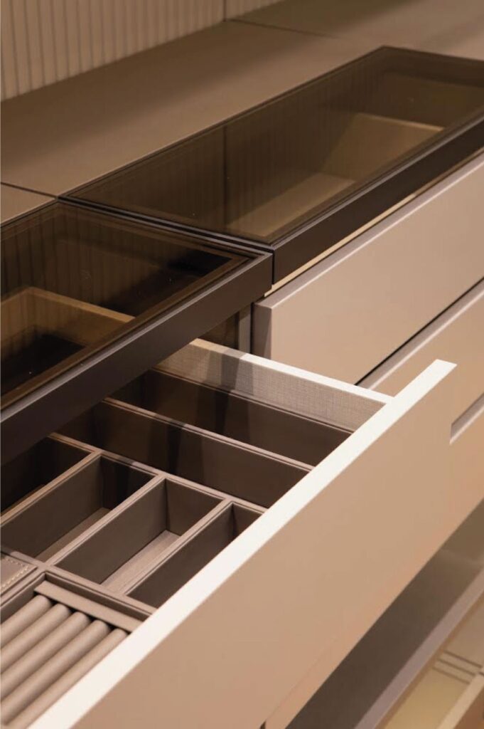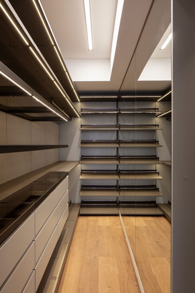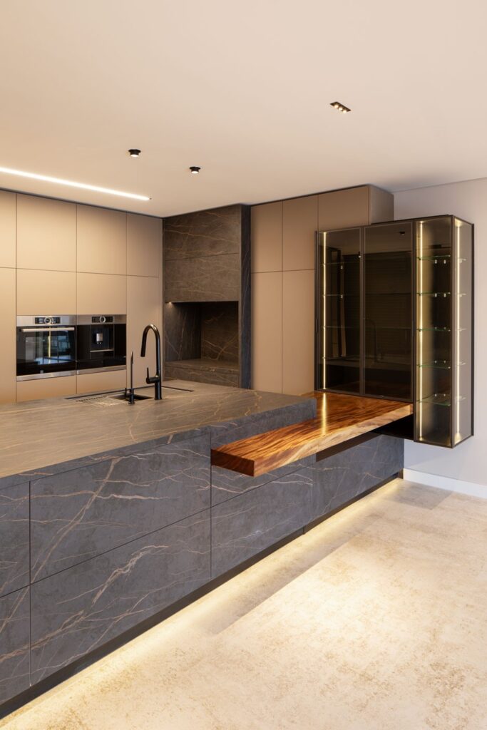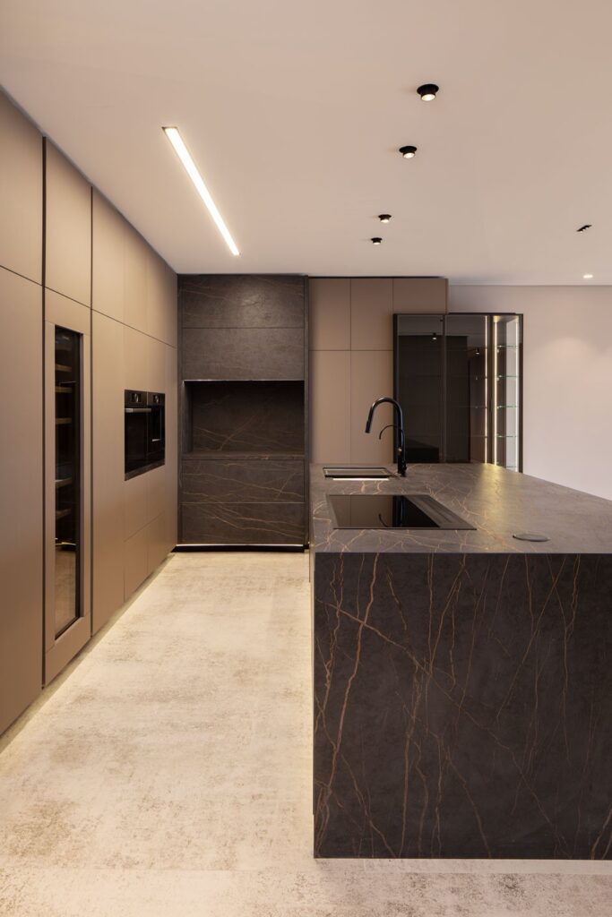 Las superficies principales se desarrollaron en Dekton, un material de alto rendimiento con resistencia al rayado, a las manchas y al calor, pensado para un uso exigente sin comprometer su apariencia en el tiempo.