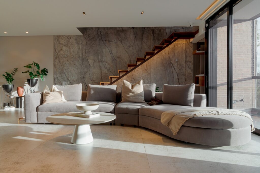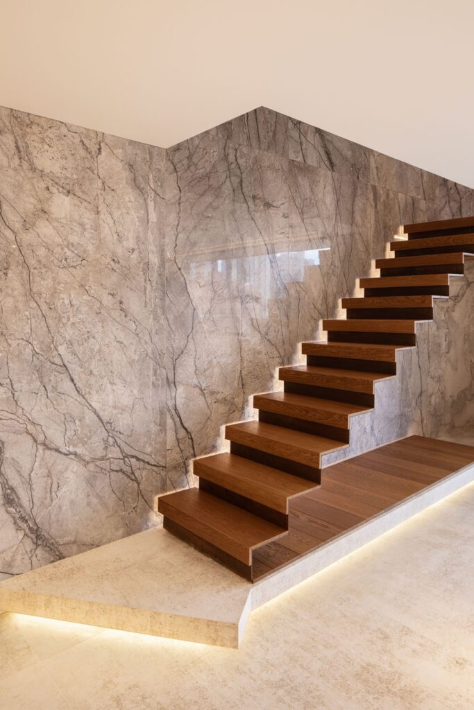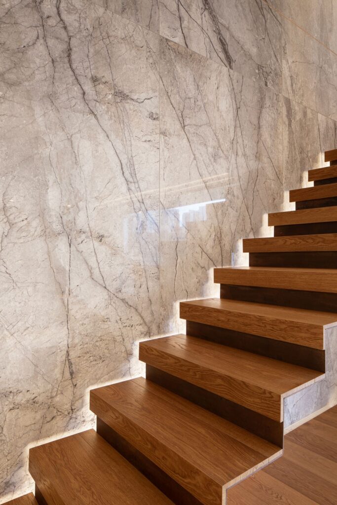 Los pasos en madera aportan calidez al conjunto, mientras que el primer peldaño flotado y el revestimiento en porcelanato de gran formato en el muro de doble altura consolidan su presencia arquitectónica.