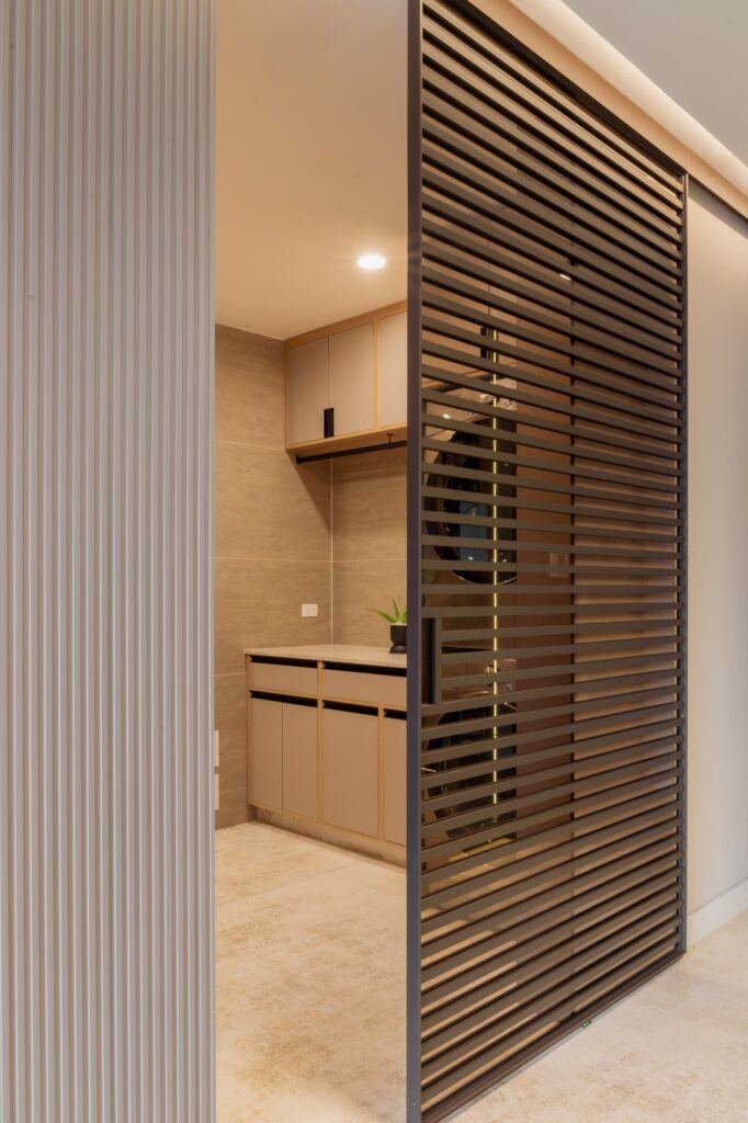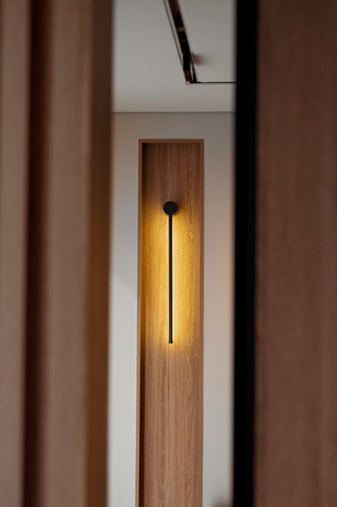 Se utilizó madera flor morado, seleccionada por su carácter y calidez, incorporando detalles de iluminación que potencian su presencia y funcionalidad.