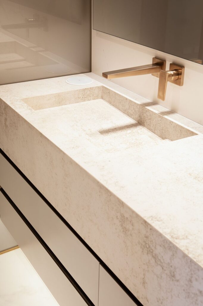 Las superficies se desarrollaron en piedra sintetizada, garantizando resistencia frente al alto tráfico y uso constante, mientras que los elementos de almacenamiento se integran de forma discreta, logrando un espacio limpio, ordenado y completamente resuelto desde el diseño.