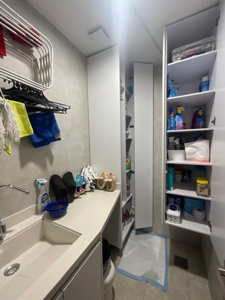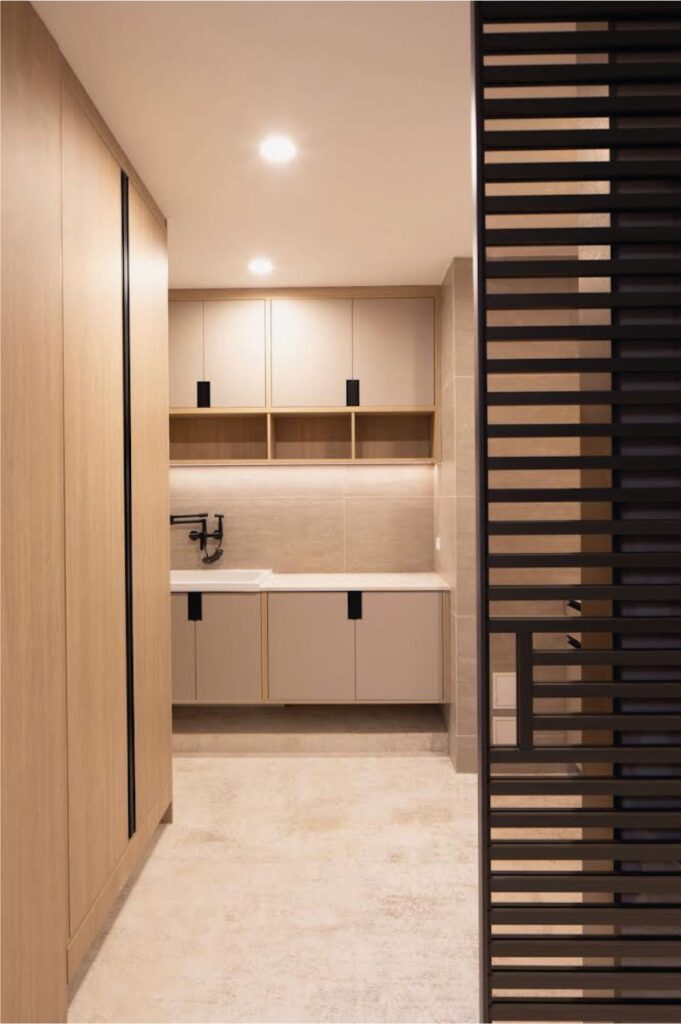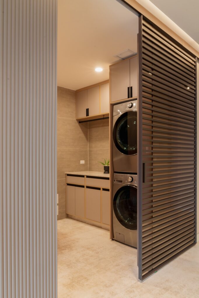 La zona de servicios se diseñó estratégicamente como un espacio de lavandería altamente funcional, integrando además un baño especializado para mascotas, respondiendo a las dinámicas reales de uso de la vivienda.