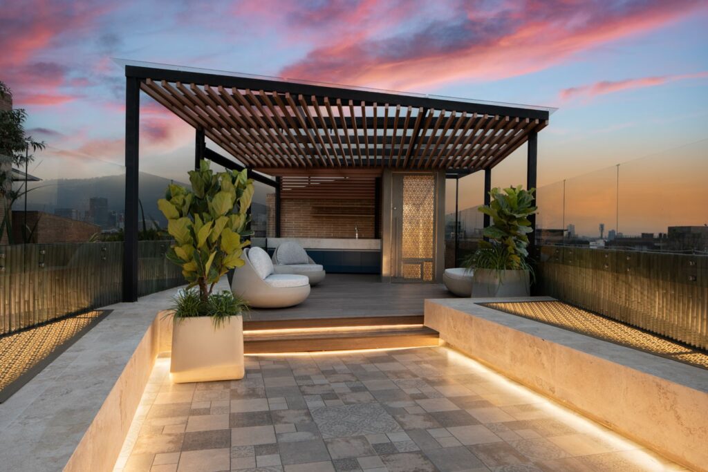 Se diseñó una pérgola que cubre una parte del área, permitiendo consolidar una zona equipada con barbecue y sala para reuniones, pensada para el uso cotidiano y encuentros sociales.