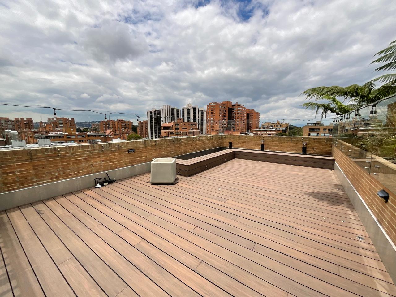 La terraza se divide en dos áreas, una cubierta y otra descubierta, que permiten diferentes dinámicas como ejercicio, descanso o contemplación de la ciudad.